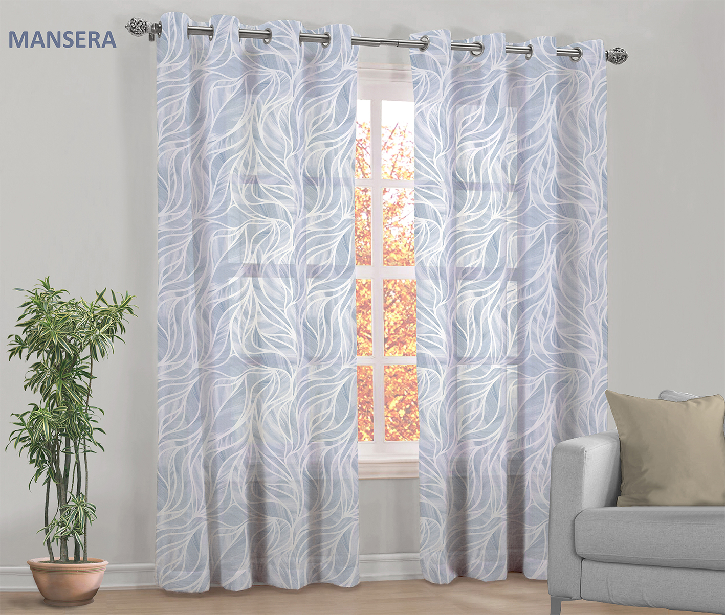 Movimento e leggerezza con la tenda MANSERA. Il suo design con motivo ondulato nei toni azzurro e bianco crea un effetto dinamico e raffinato, capace di donare personalità e freschezza agli ambienti. Una soluzione perfetta per chi ama arredare con stile moderno e delicato.